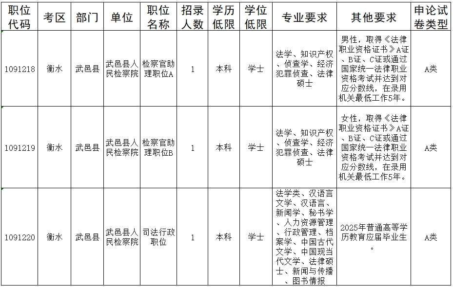 武邑县人民检察院计划招录公务员3人,岗位为检察官助理2人,司法行政人员1人。